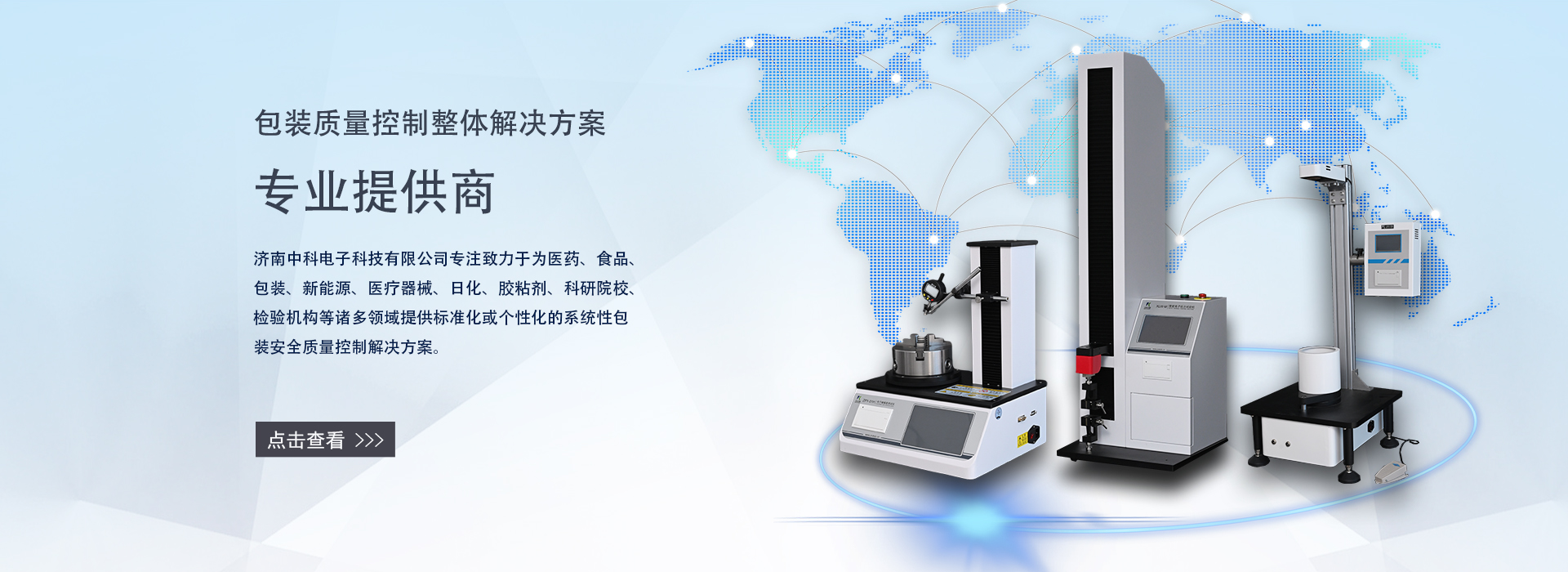 濟(jì)南中科電子科技有限公司是一家集包裝及膜材檢測(cè)儀器的研發(fā)、制造、銷(xiāo)售和服務(wù)為一體的專業(yè)科技公司。專注致力于為食品、醫(yī)藥、包裝、新能源、醫(yī)療器械、石化、日化、膠粘劑、科研院校、檢驗(yàn)機(jī)構(gòu)等諸多領(lǐng)域提供標(biāo)準(zhǔn)化或個(gè)性化的系統(tǒng)性包裝及膜材質(zhì)量控制解決方案。